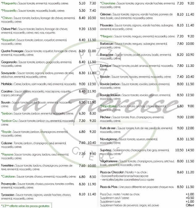 Chez « Pizza La Gièroise », vous trouverez un lieu de rencontre optimal pour des week-ends en toute tranquillité, pendant lesquels vous passerez de beaux moments ensemble. Nous proposons des repas pour chaque moment. Notre camion-restaurant est un parfait avec une très bonne sélection de plats et de boissons pour la pause déjeuner. C’est aussi un lieu de rencontre parfait pour le weekend. nn Nous proposons aussi des plats végétariens à nos invités – donc tout le monde trouvera une spécialité à son goût. Nous voulons vous aider à faire attention à votre santé et vous sensibiliser à l’importance d’une alimentation saine et gourmande.
